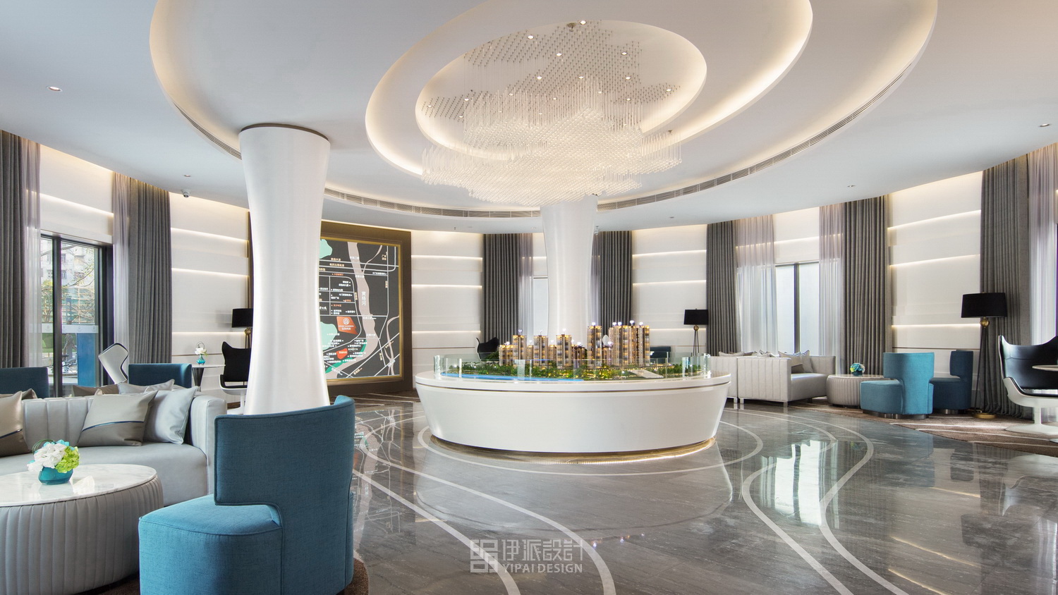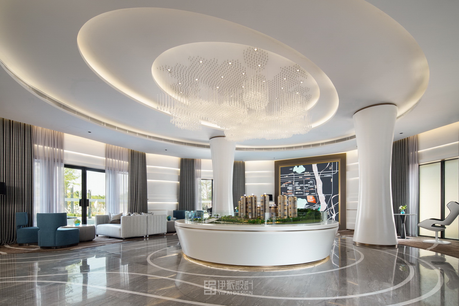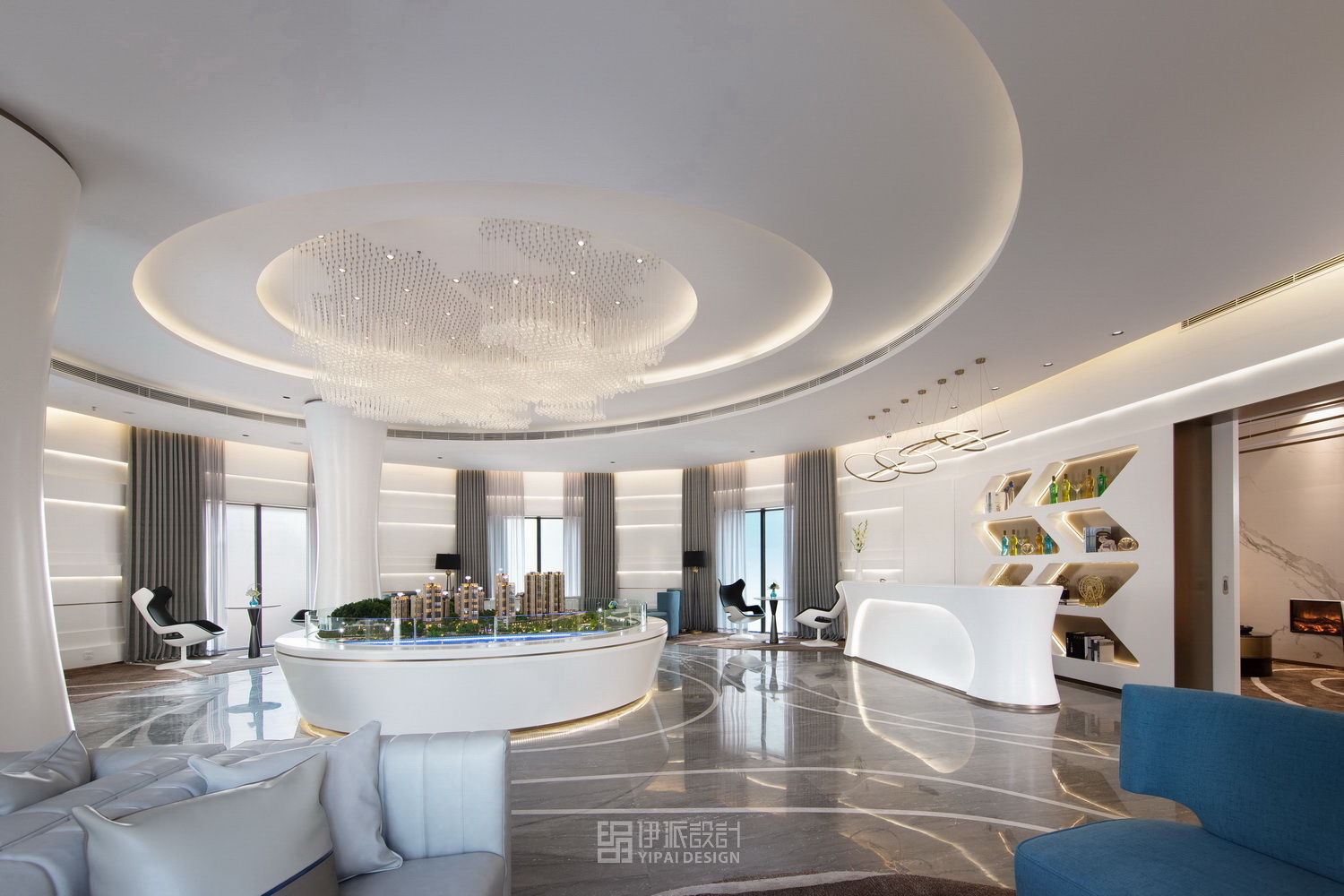 在設(shè)計(jì)中,利用人文與自然的結(jié)合,突出城市印象和地理優(yōu)勢(shì)。售樓中心根據(jù)珠海本地的氣候條件和對(duì)項(xiàng)目顧客群定位的研究,確定了在結(jié)合功能、美觀、經(jīng)濟(jì)的前提下,突出簡(jiǎn)約、明亮、時(shí)尚的設(shè)計(jì)空間理念。接待前廳是售樓中心的第一觀感,以波紋樣式為曲線界面設(shè)計(jì)主題,寓意于韻律藝術(shù)中照見(jiàn)斗門明珠的璀璨。