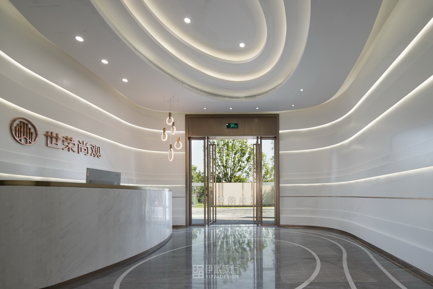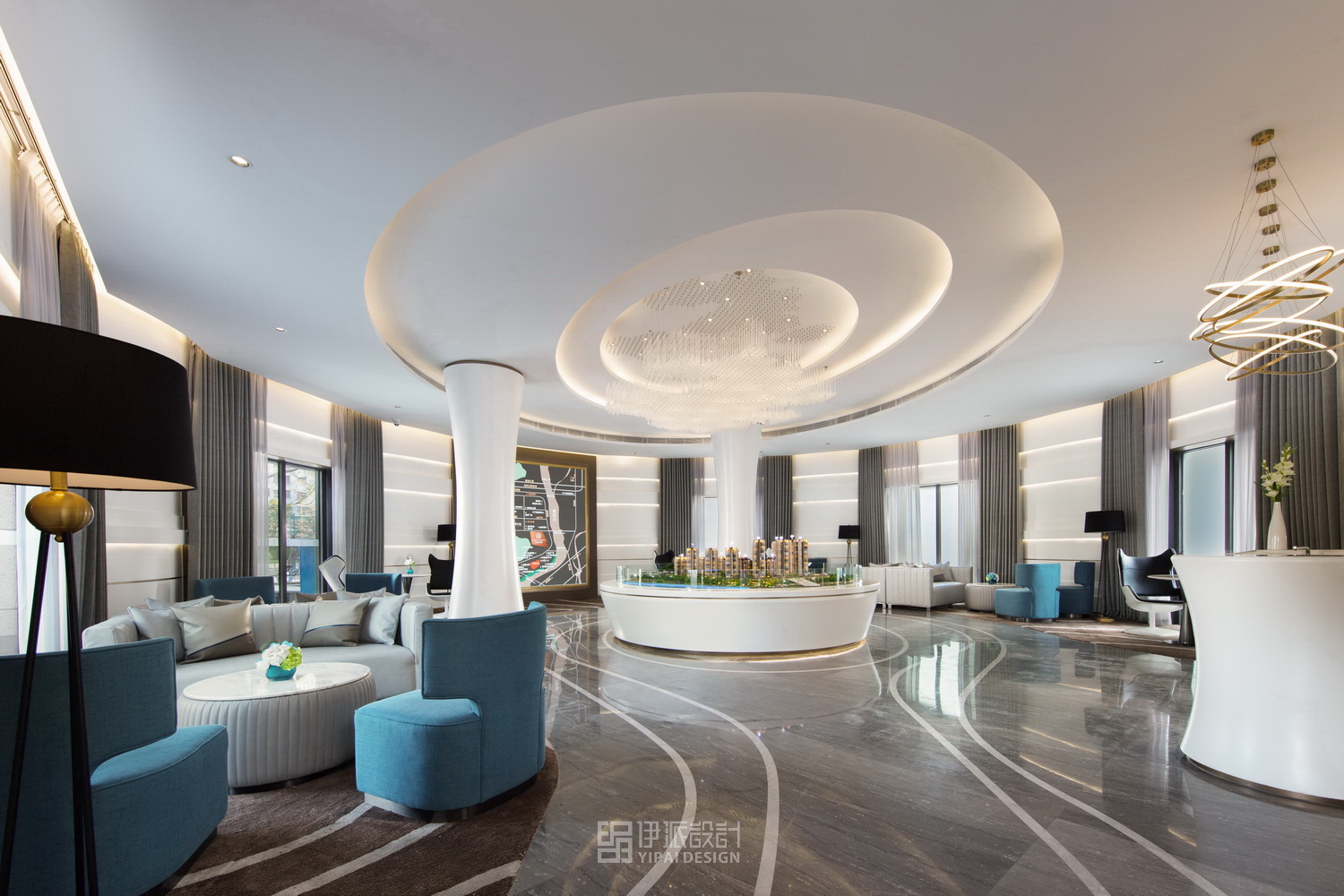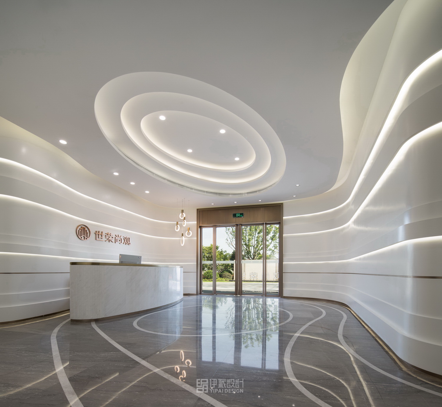 在設(shè)計(jì)中,利用人文與自然的結(jié)合,突出城市印象和地理優(yōu)勢(shì)。售樓中心根據(jù)珠海本地的氣候條件和對(duì)項(xiàng)目顧客群定位的研究,確定了在結(jié)合功能、美觀、經(jīng)濟(jì)的前提下,突出簡(jiǎn)約、明亮、時(shí)尚的設(shè)計(jì)空間理念。接待前廳是售樓中心的第一觀感,以波紋樣式為曲線界面設(shè)計(jì)主題,寓意于韻律藝術(shù)中照見(jiàn)斗門明珠的璀璨。