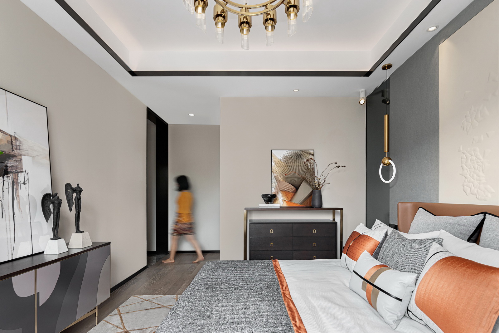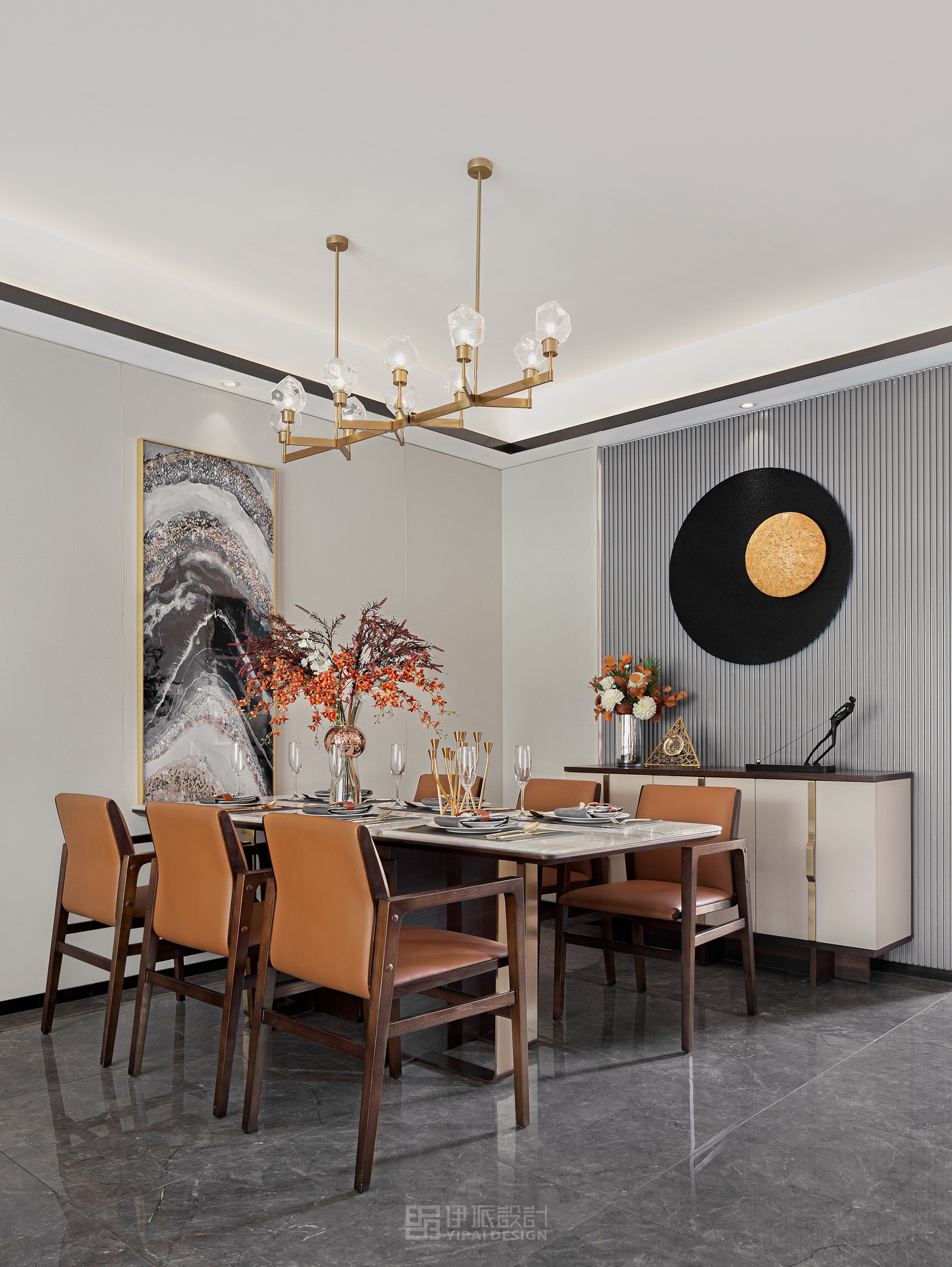 本案風(fēng)格為現(xiàn)代港式風(fēng)格,采用時(shí)尚精簡(jiǎn)、低調(diào)內(nèi)斂的高級(jí)灰是用于家居裝扮的首選基調(diào)色彩,呈現(xiàn)優(yōu)雅魅力和精致大氣的視覺感官,符合人們對(duì)現(xiàn)代生活的審美需求。同理,作為潮流都市代表色之一的暖橙,伊派設(shè)計(jì)在居家設(shè)計(jì)中的運(yùn)用中,讓空間張揚(yáng)不浮夸、經(jīng)典且時(shí)尚,成為永恒不變的奢侈品味。