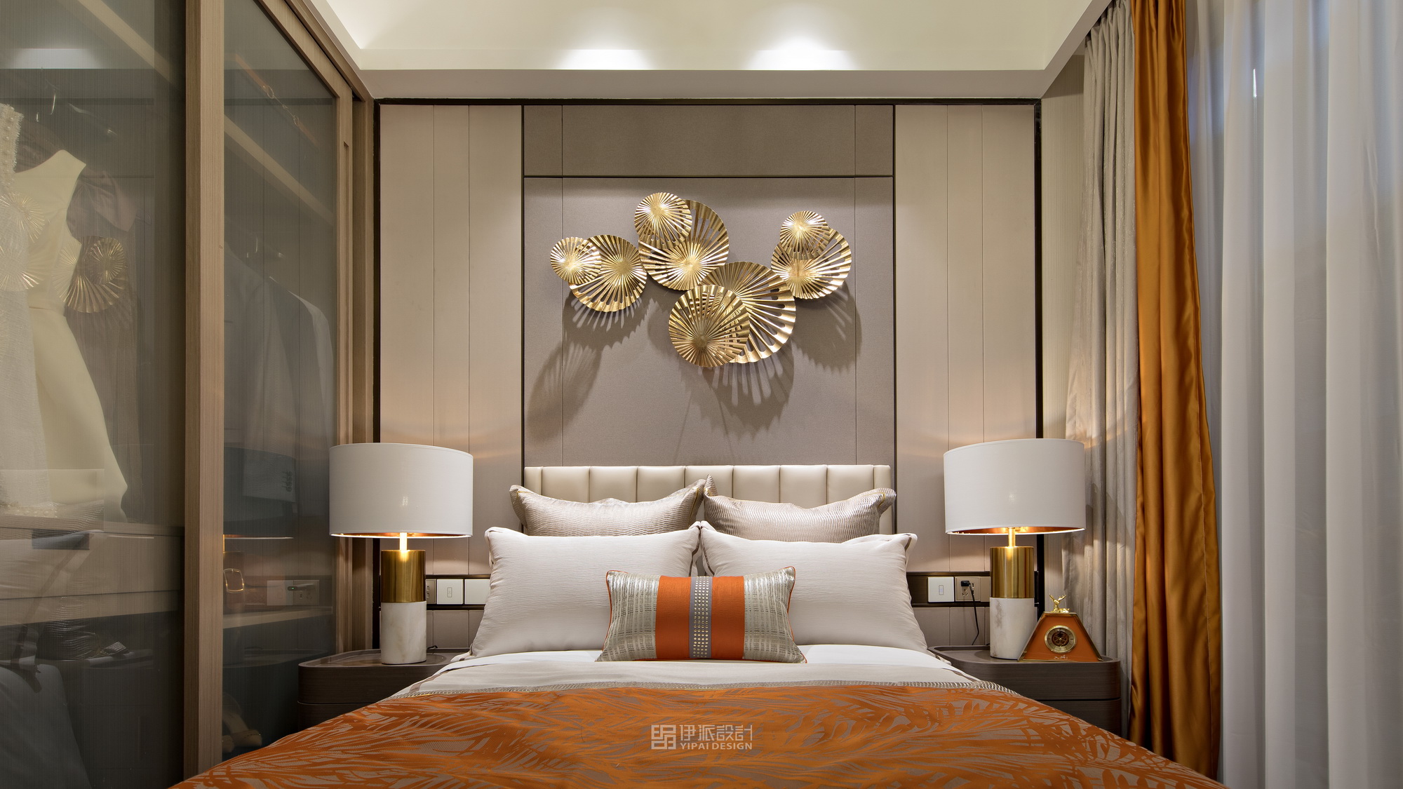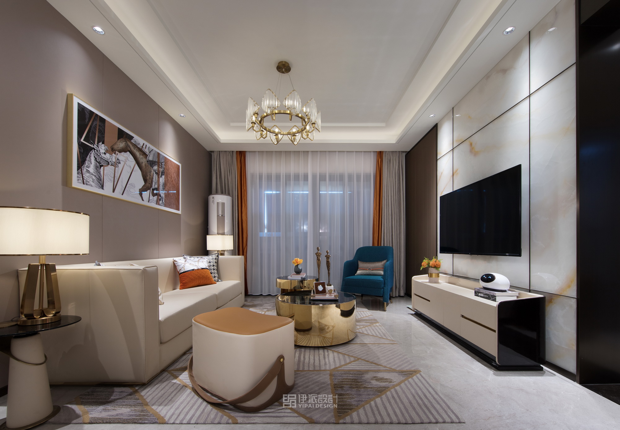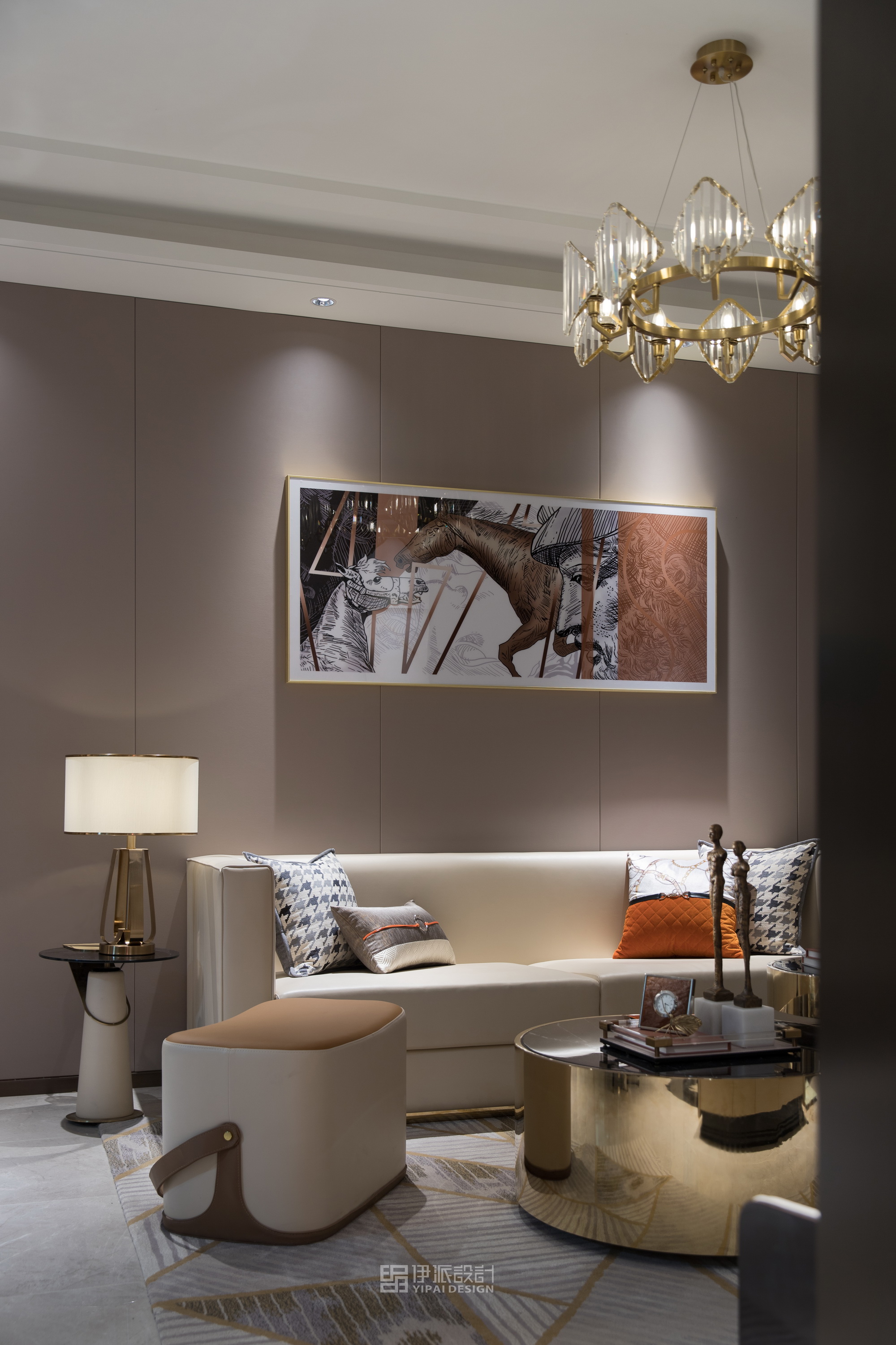 本案軟裝設計工程針對現(xiàn)代空間的美學思考,將上世紀的雕像與現(xiàn)代藝術,融合出獨具一格充滿西方氣息的藝術空間,神秘感縈繞其中,將“愛馬仕橙”作為設計核心,以港式輕奢的格調來定義空間的精神氣質,演繹品質高貴生活。