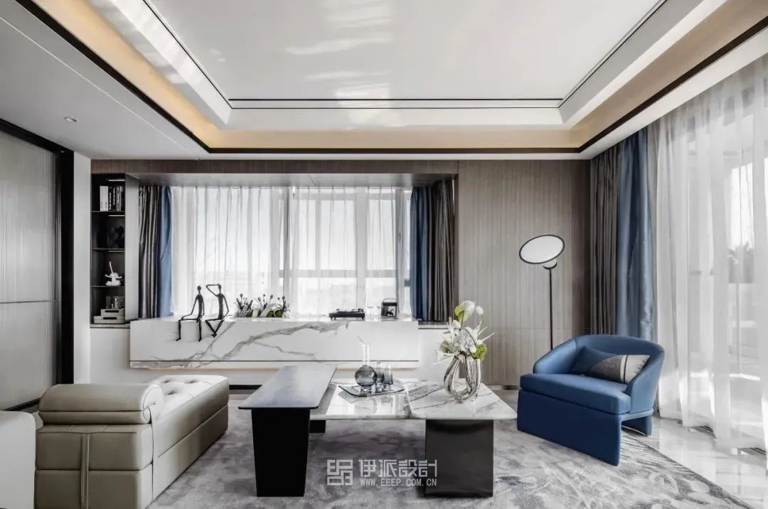 伊派設計意在為居住者打造一個低調(diào)而雅致的空間,本案整體色調(diào)以香檳色、米白色為主,優(yōu)雅的藍色平衡兩者又強調(diào)著自身的個性,共同營造輕松安逸的環(huán)境。